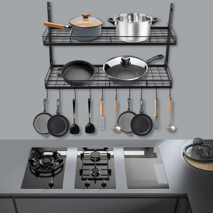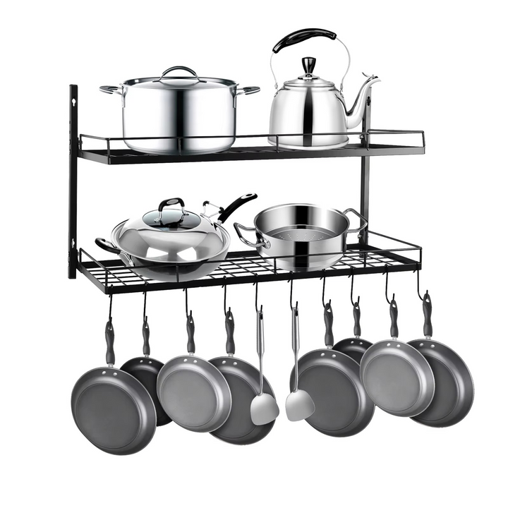 Hanging Pot Rack Wall Mounted 2 Tiers Pot and Pan Hanging Rack with 10 Hooks Kitchen Pan and Pot Hanger for Pot Storage Rack
